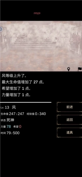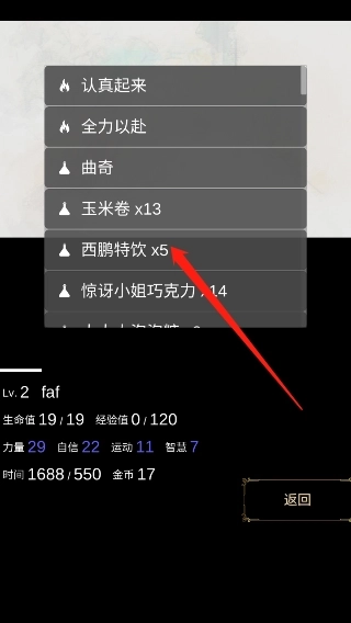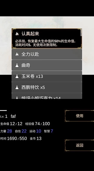 3、左下角是自己的等级、生命值、时间、金币以及经验值等信息,你会遇到很多随机事件,可以选择战斗或者逃跑。