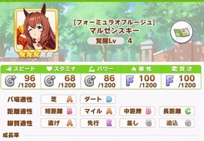 建议挑选耐力与速度属性出色的来继承,不管是参加菊花赏还是有马赛程的,都得适当加点耐力。礼装组合方面:绿色恶魔搭配5速,或者4速1耐的配置都可以,毕竟是逃马培养,多数速度SSR礼装都挺适配;也可以选择4速、小海湾再加上绿色恶魔的组合。