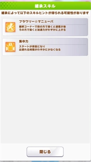 4、对比来看,第二种因子继承的方法显然比第一种更稳定实用,综合收益也更高。具体操作是:先通过万圣节支援卡或川上公主培育马娘,让她学会“永不停歇的少女”技能;培育结束后,这匹马娘有概率获得该技能的白色因子;之后选择她作为种马,就能把技能继承给下一位目标马娘。
