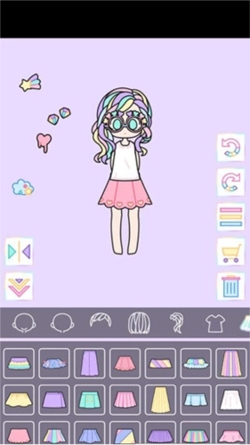 2、进入游戏后,映入眼帘的是梦幻感十足的彩虹色封面。游戏内提供了数十种表情可供选择,还能分别搭配刘海与发型,这些发型和刘海大多是软萌的七彩配色,玩家可依据心情自由组合。此外,还有各式各样的上衣、连衣裙,以及能让角色做出不同动作的外套可供挑选。我们还能选择风格各异的装饰物来装点画面,再配上可爱的对话气泡与字母元素,让每个角色都能展现出独一无二的个性。