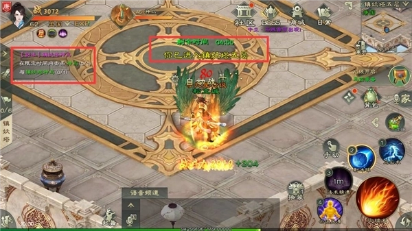 ③挑战界面开启自动战斗就行。左侧任务栏可以查看任务信息。镇妖塔每层挑战限时5分钟。要是想继续挑战,点击“前往下一层”即可。