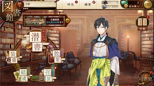 选好初始文豪后就会进入图书馆界面,这个界面类似《刀剑乱舞》里的本丸,是游戏的初始界面。管理员的名字会自动采用DMM账号的名称,游戏内的各类按键和按钮都清晰展示在画面上,点击左上角能够隐藏这些按键。右侧的人物是助手,作用相当于《刀剑乱舞》的近侍,近侍的更换方式会在后续的司书室部分说明。右上角的设置按钮可以调节声音大小,其中第一条“ボイス”对应的是人物语音。