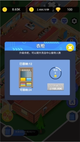 想要提高收入,顾客的到访频率是限制你收入的重要来源,所以增加更多更衣柜才能容纳更多顾客。同时,提升泡澡区域的营业口碑可以为你带来更多人气。
