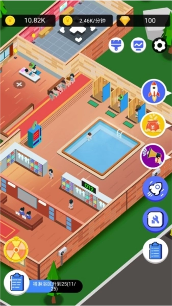 1.游戏几乎没有难度,游戏非常易上手,即使没有教程,也可以拿下游戏,游戏机制非常简单,经营一个浴室,升级浴室设施,不断打造,更豪华的浴城。