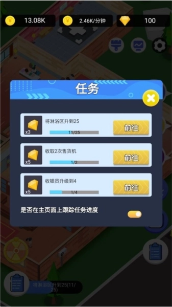 对于新手玩家,如果不清楚自己的下一步该如何行动,那么尝试查看下方的任务指示来进行洗浴中心的建造与模拟。