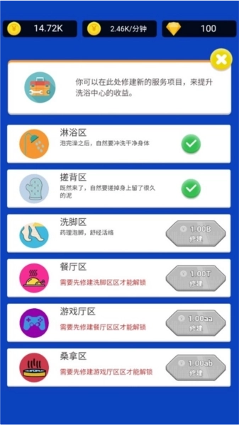 随着玩家资金的积累,你还能建设如搓背区、桑拿区、餐厅区、按摩区、街机区等各类服务项目。