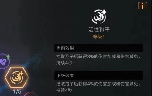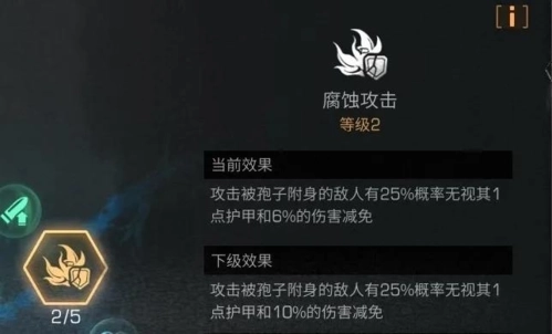 2、腐蚀攻击可带来更高伤害,提升至5级后,对被孢子附身的敌人有30%几率无视其2点护甲与10%伤害减免;活性孢子能让武士进团后将该技能升至5级,拾取孢子后可获得8%伤害加成与8%伤害减免,效果持续8秒。