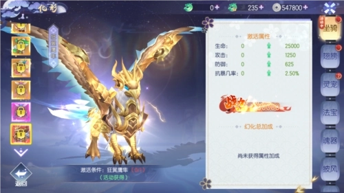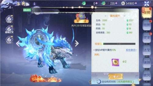 点击界面上的坐骑按钮,就能打开坐骑界面,界面里能看到各项属性加成的具体数值。对坐骑进行培养进阶,不仅能提升这些属性数值,还能解锁更多技能或更炫酷的外观。