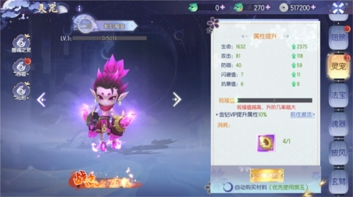 点击界面上的灵宠按钮,即可打开灵宠界面。在该界面中,我们可以查看灵宠的生命、攻击、防御、闪避、抗暴等基础属性。