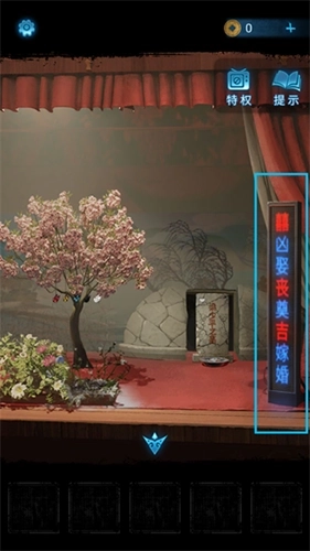 8、回到上一个房间,能看到墓碑前的LED屏已经开启,留意屏上的字体。按照屏上红色字体的顺序,打开观众席左侧座位上的盒子。需要注意的是,顺序从上到下依次是奠-丧-婚-吉-嫁。这里先说明第一步的操作方式,后续的操作就比较简单了。打开盒子后,即可获得【化妆笔】。