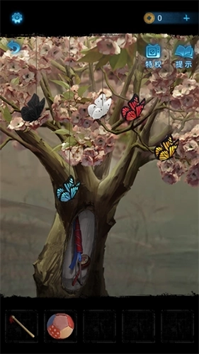 15、点击右侧的小戏台,通过手机能看到五个颜色各异、高低不同的人偶。返回戏台场景后,点击戏台旁树上挂着的五只蝴蝶。