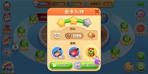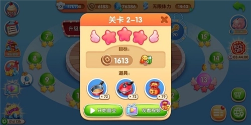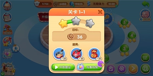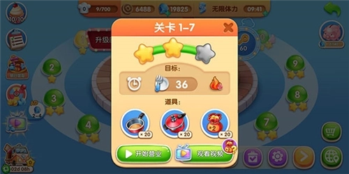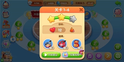 4、当然啦,要是碰到还没通过的关卡,也别灰心丧气,可以先去升级一下厨房,之后再重新挑战;或者在闯关的时候用上道具,就能更轻松地通关啦!