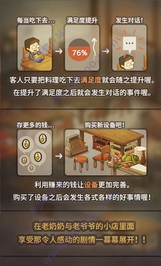 新众多回忆的食堂故事最新版是一款充满温暖治愈感的模拟经营游戏。在游戏里,你要协助老奶奶打理一家食堂,和前作相比,新增了一位名叫毛毛的新手店员,能帮老奶奶做洗碗、上餐、送外卖之类的活儿。游戏玩法很简单,你需要帮老奶奶做出各式各样的美食,满足不同顾客的需求,以此赚取更多金币,这些金币可以用来解锁更多店铺设备,还能研发更多美食菜谱。