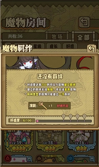玩家挑选自己已培养出好感度的魔物,点击开启羁绊按钮,就能解锁与该魔物的一级羁绊关系。建立羁绊后,玩家可解锁和魔物相关的进阶任务与剧情;同时,魔物还会获得额外属性加成。随着好感度逐步提升,玩家能持续解锁新剧情与新的属性加成福利,感兴趣的玩家可别错过这一玩法。