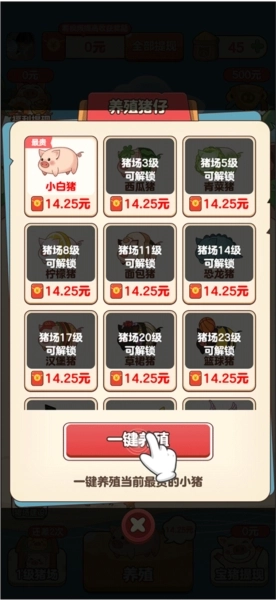 2、点击“一键养殖”按钮就行,要是解锁了更多猪仔,你可以自主挑选要养殖的猪仔