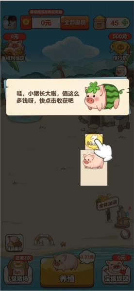 3、等猪仔长大以后,点击就能收获,收获猪仔就能得到红包奖励