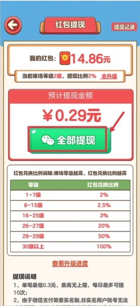 6、用户获取的红包及其他各类奖励,满0.3元即可提现至微信;猪场等级越高,对应的可提现比例也会随之提高。
