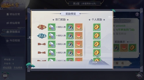 4、最后再说说宗门战的奖励。宗门战的奖励相当丰厚,主要分为个人奖励与宗门奖励两部分。个人奖励是大量的宗门贡献,宗门奖励则包含大量声望以及各类物品等。另外要提一句,部分奖励和报名人数是挂钩的,所以建议大家尽量加入活跃人数较多的宗门。
