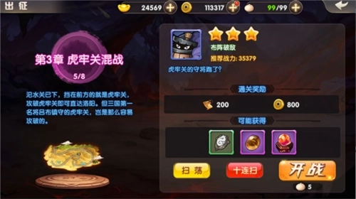 出征获取的资源包括:武将碎片、突破石这类用于英雄强化的资源;铜钱、主角经验、武将经验这类用于升级的资源;装备强化图纸、装备碎片、统率石、勇武石以及各类装备强化所需的资源。
