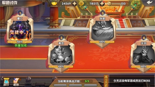 练兵场的军团副本,不仅能获取铜钱,还能得到军团宝箱与军团玉石盒,开启后可获得招贤令、升品玉石等资源,每天有三次机会,可别忘了!