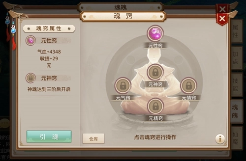 神魂之外,另有魂窍的存在。魂窍的属性需注入太阴之气方可激活,而太阴之气可通过在地藏王处进行冥海引魂的方式获取。从下图能够看到,魂窍总计5个,只有当神魂提升至特定阶数时,才能开启相应的魂窍。