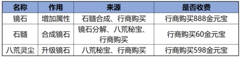 b.在八荒相关玩法里(像八荒秘宝、仙使事件这类),有一定概率得到各种类型的石髓,把石髓合成为镜石后,就能镶嵌到映心镜上,为角色、宠物和娃娃提升战斗属性(此属性在所有情况下都会生效)。