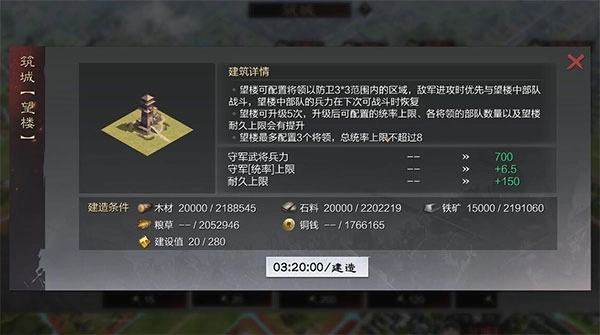 此次更新取消了升级望楼所需的政令消耗。其建造与升级规则和流浪军的上墙队玩法相同,需在已占领的地块上进行。当存在多个望楼范围重叠的情况时,部队只会与其中一个望楼发生交战;若望楼与城池范围重叠,部队攻击城池时则不会与望楼交战。