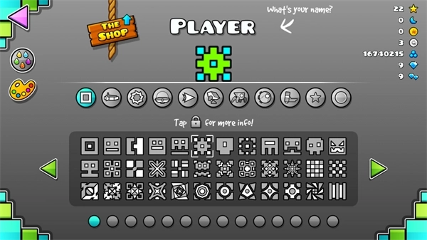 在几何冲刺精简版里,玩家能看到种类繁多的主角外形可供挑选。我们在闯关过程中会得到能量点,只要能量点积攒到足够数量,就能解锁不同外形的方块啦。
