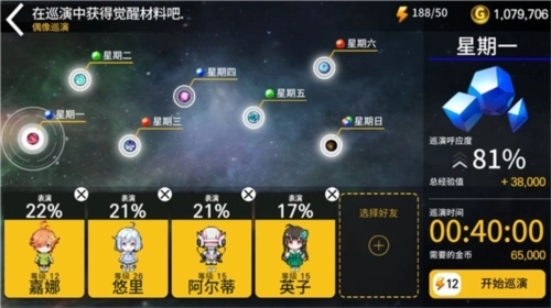 3、要是我们需要蓝色材料,周一或周四的巡演是可选的,届时偶像系统会提示哪位偶像的契合度更高。需要留意的是,处于巡演中的偶像无法参与比赛,也不能再另行安排日程。所以具体如何安排偶像的巡演,大家可以依据自身需求来决定。我个人通常会在不打比赛的时候,比如手机充电时,安排巡演,并且选择系统显示契合度最高的偶像。