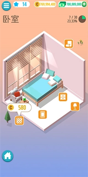 1、进入房间后,我们只需点击任意一个橙色图标,就能消耗金币启动装修流程。