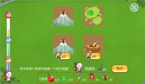 我们沿途会碰到各种各样的药材,每次都能从两块地里面挑一块来挖。鱼友们可以依据自己需要的材料和铲子的数量,决定要挖掘哪块地。