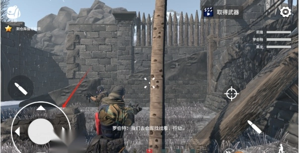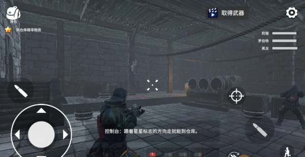 2、点击左侧的轮盘可以操控角色进行移动,右侧则是射击、换弹、下蹲等按键;