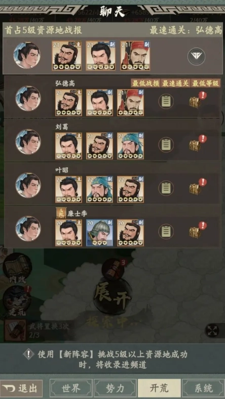 探索开荒过程中首次攻克高级资源地的阵容,系统会自动将其收录至榜单,无需自行搭配阵容,直接查看榜上阵容即可,点赞该阵容还能获取额外奖励。