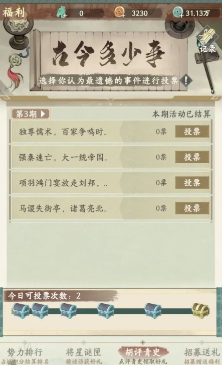 青史向来由后人评说,而今天各位主公也能亲自参与评判青史——你心中最遗憾的历史事件是什么?最荒诞不羁的野史又有哪些?期待各位主公的独到见解。参与投票即可领取奖励。