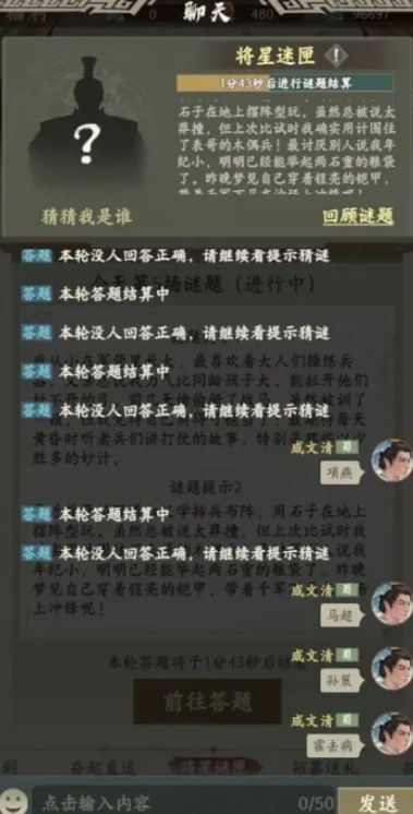 活动期间,会有一位武将通过对白讲述自己的经历与特点,主公们可发送聊天信息参与猜谜。