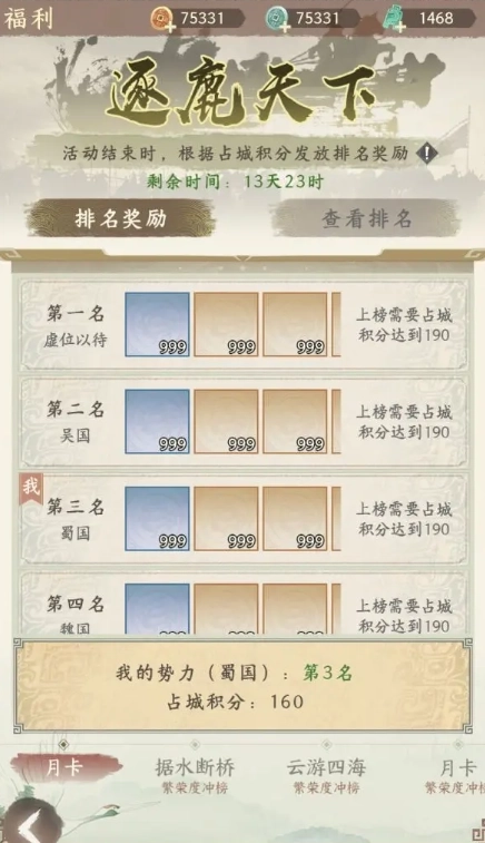 -新增【逐鹿天下】玩法:这是一项福利活动,会依据玩家所在势力占领的城池数量进行排名,参与者可获得丰厚的通宝奖励。