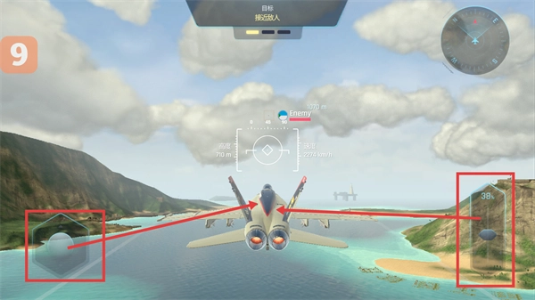 通过左侧操作区操控飞机,朝着【Enemy】的方向飞行,借助右侧的进度提示,逐步【接近敌人】,达成各任务阶段的目标。
