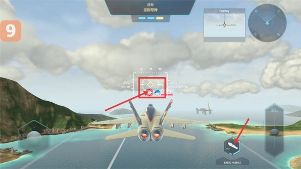 当【Enemy】进入瞄准框后,点击右侧的【BASIC-MISSILE】导弹按钮,执行【发射导弹】的操作,以此精准打击敌人。