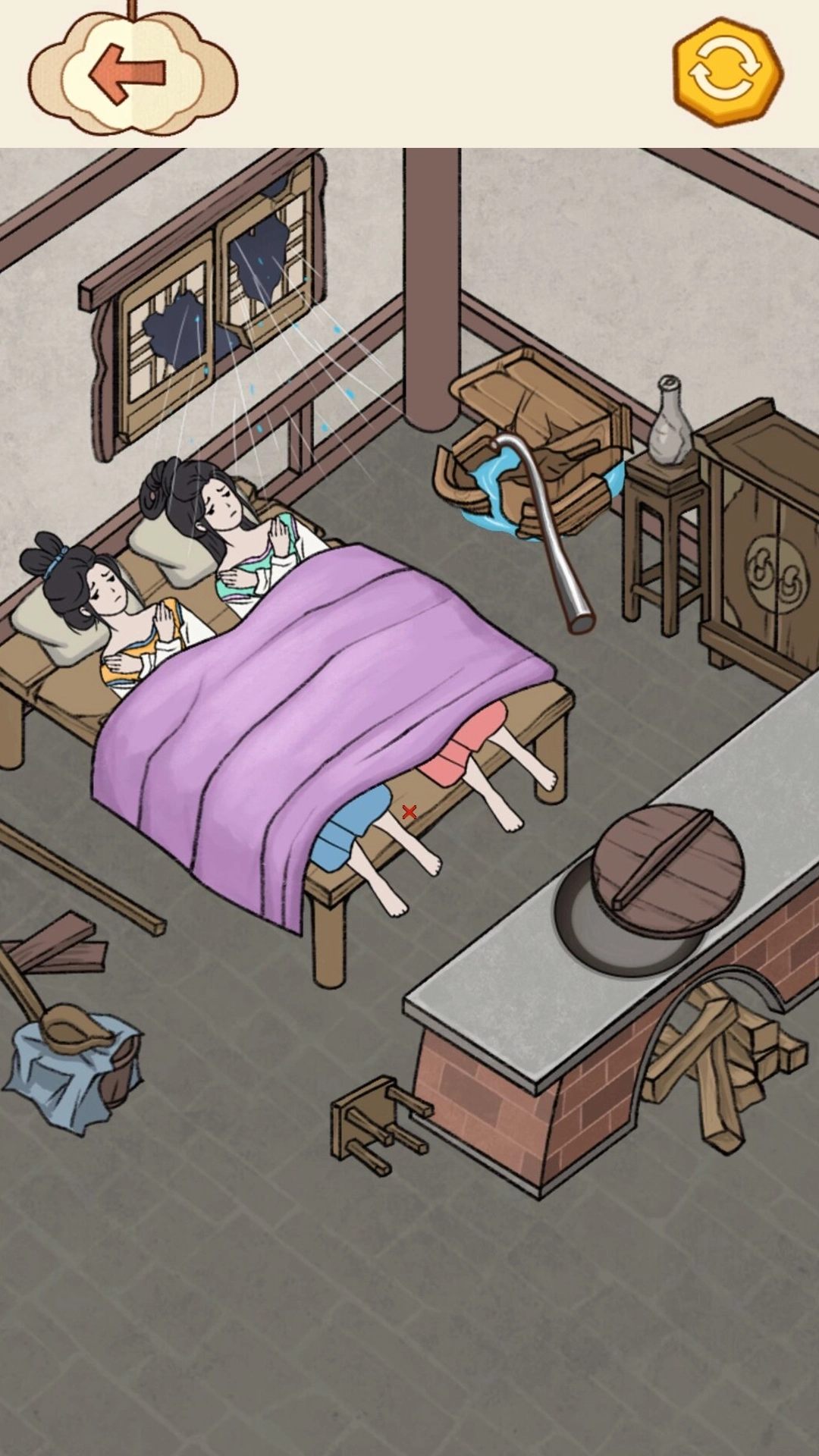 1、首先玩家要明确这一关卡的目标是让小姐姐暖和起来,同时让房间既不透风又能保暖,第一步需要把木板拖到门窗的位置将其封住。