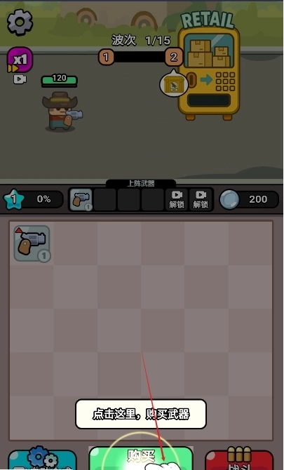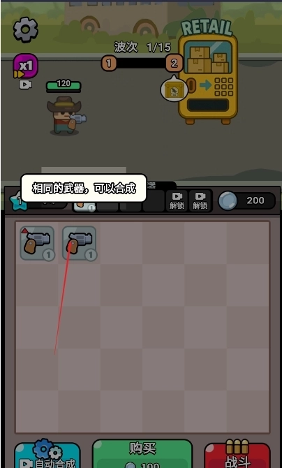 1.在零售机选购武器时,若拥有星级相同的武器,可将它们合成更高级别的武器!
