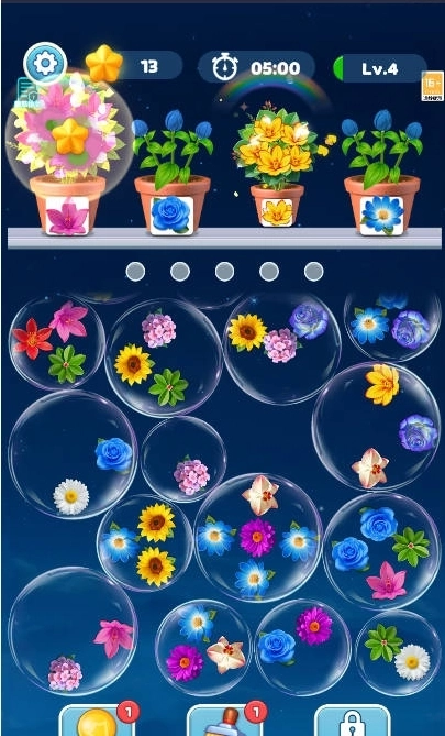 1、游戏屏幕上布满了漂亮的花朵与闪亮的气泡,色彩丰富且十分耀眼。