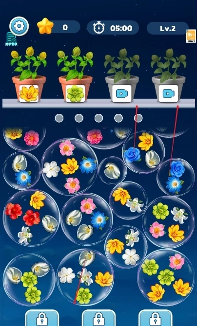 规则直观易懂,新手能快速上手并轻松开启游戏;上方的花盆作为明确的消除目标,让玩家清晰把握操作方向,避免盲目消除,使每一步都更具针对性。