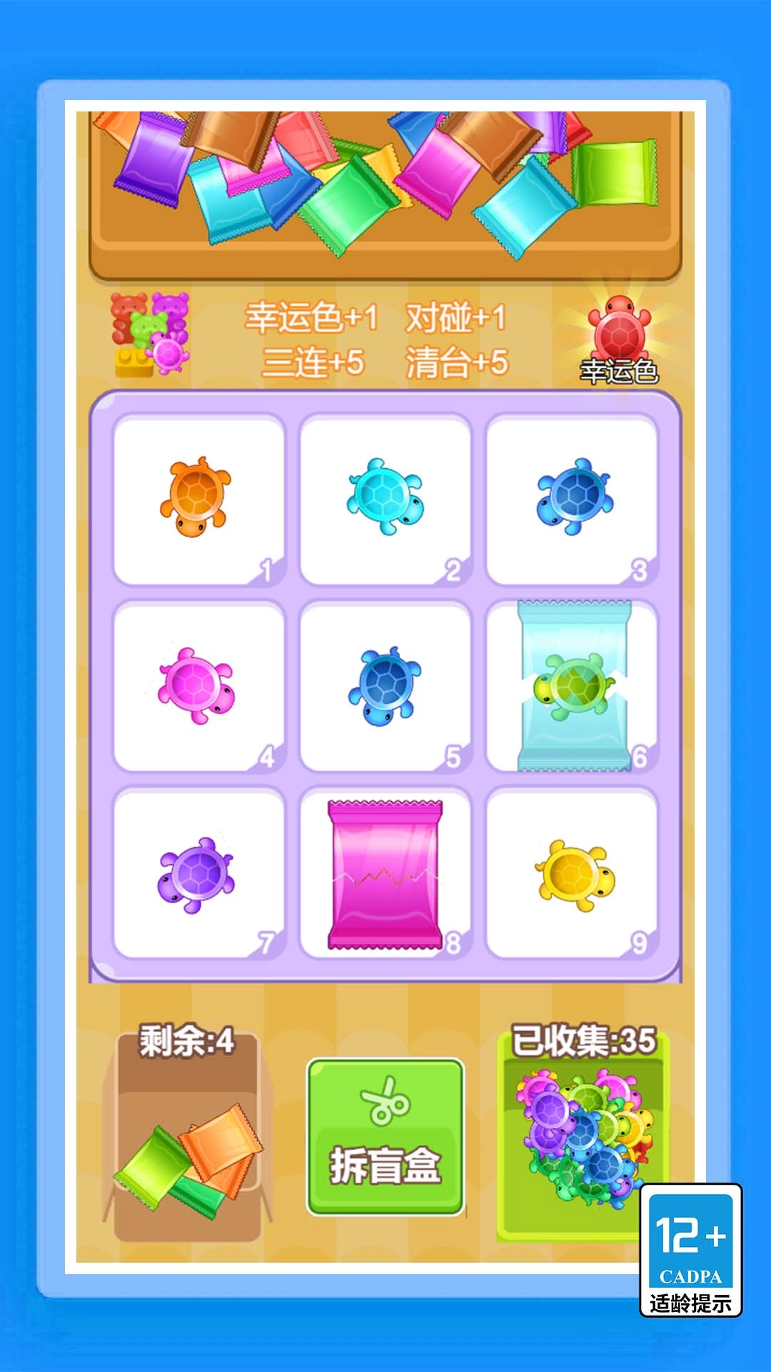 游戏围绕可爱的小乌龟展开,玩家通过开启盲盒收集不同颜色的乌龟来进行消除操作,达成任务目标即可领取奖励。