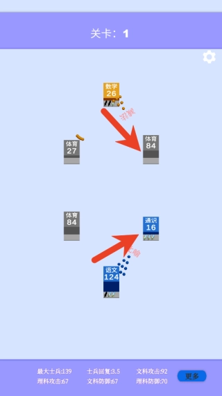 布置完成后,点击己方需要操作的学科方块,接着用手指在屏幕上滑动来选定弹道方向,向任意一个敌方学科发射炮弹。每次成功命中都会减少对方方块上显示的数值。