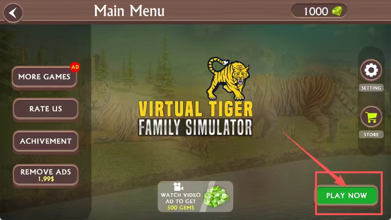 一旦察觉到幼崽被野狼盯上,你要立刻发出震耳欲聋的咆哮,以此吓退敌人保护幼崽。到了夜晚,你还得叼着刚捕获的新鲜猎物返回巢穴,喂养嗷嗷待哺的虎宝宝。游戏启动后,在主菜单界面点击位于中央的绿色“PLAY NOW”按钮就能开启游戏。