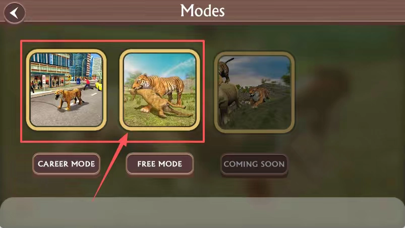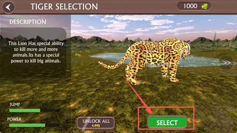 进入角色选择界面后,右侧会出现斑点老虎的形象,点击其下方的“SELECT”按钮,即可确认选中这只老虎。