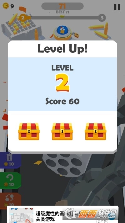 2:随着玩家的轻松取胜关卡的不断往后游戏的难度也会慢慢增加,想要将瓶子全部击倒就没有那么容易了,力度的控制在这时显得尤为重要。