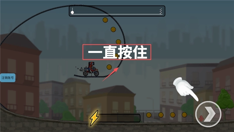 1、进入游戏后,你会看到角色骑着摩托车行驶在赛道上,画面上方显示着进度条和金币,要记得一直按住屏幕来维持动力,让摩托车持续前进。