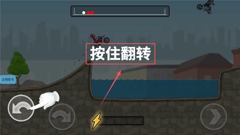 2、碰到图中这种坡道时,留意屏幕下方会弹出“按住翻转”的提示,按照提示操作翻转车身即可,但要掌握好时机,否则可能会坠入水中。