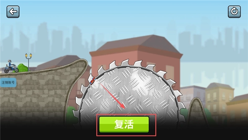 3、在游戏界面中,你能看到城市建筑作为背景,还有一个醒目的锯齿状转轮,转轮前方有红色箭头标明方向,下方则设有绿色的“复活”按钮。